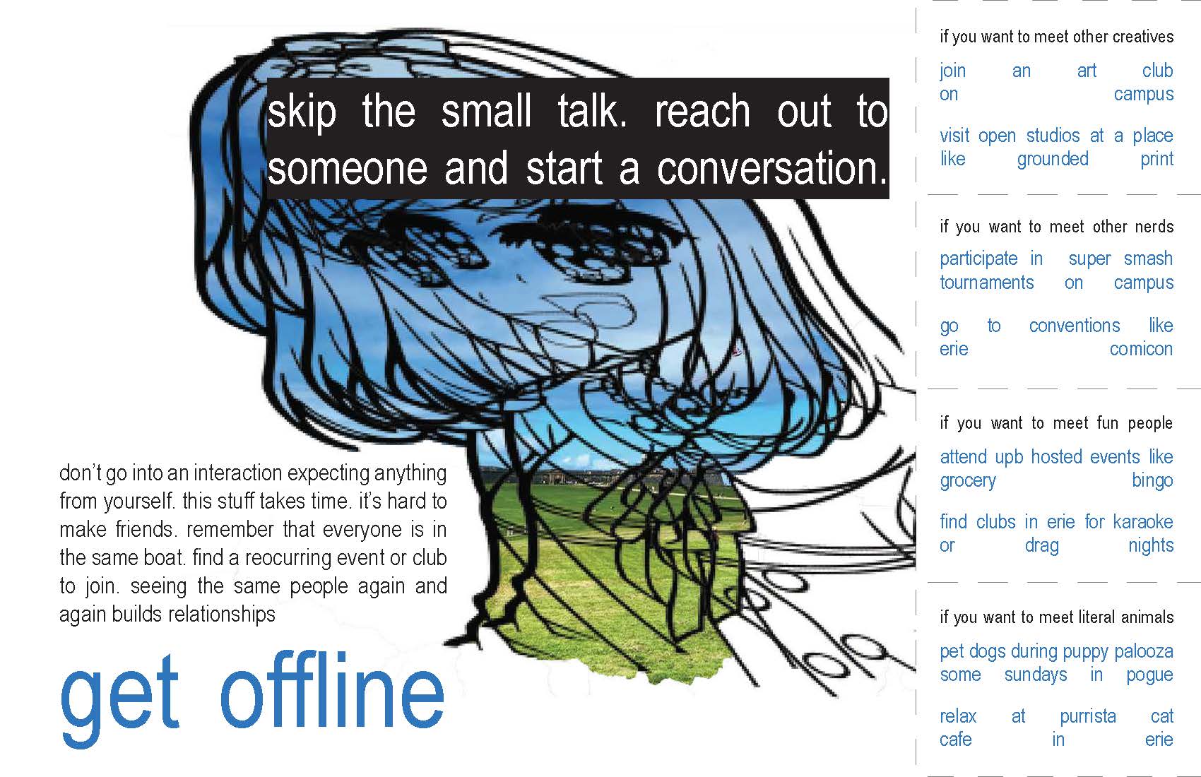 This project was visually inspired by online communities and they way they use imagery to communicate. I created two posters that included prompts that the viewer could take as a way to make conversation a bit easier.